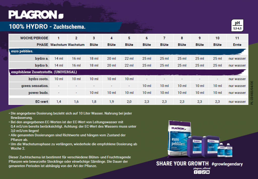 Für den Anbau in Erde oder Kokos bietet Plagron spezielle Tabellen, die die Dosierung von Düngemitteln für jede Woche im Wachstum und in der Blütephase angeben.